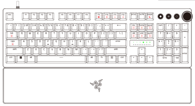 The Razer keyboards have different secondary key functionalities. These are highlighted in red in the images below.