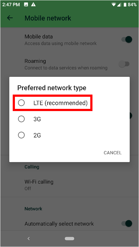 - Ensure that the “Preferred network type” is “LTE (recommended)”. By choosing this, LTE will be your default network type, but it will automatically switch network types if the signal goes down.
